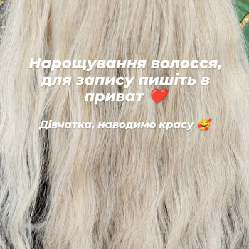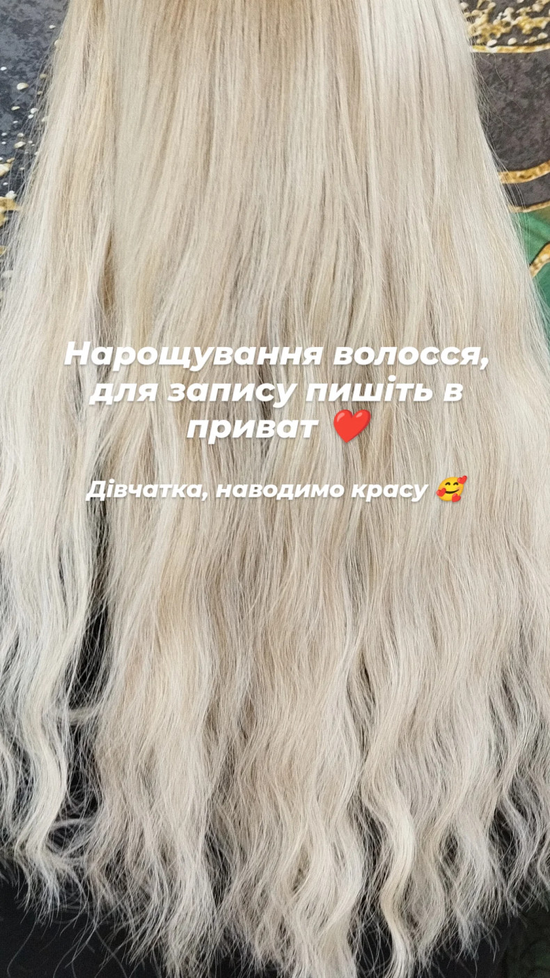 Надаю послуги нарощування волосся з якісних та перевірених матеріалів. Працюю з натуральним та біоволоссям. Технологія - капсульне нарощування, робота мікрокапсулами. Надійний та довготривалий результат.