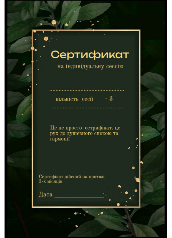 Подарунковий сертифікат на консультацію психолога це не просто подарунок — це турбота, увага і крок до внутрішнього спокою та гармонії. Сертифікат дає право на індивідуальні зустрічі з психологом Тетяною Васильчук (кількість сесій вказана у сертифікаті). Ідеально підійде як: • подарунок для близької людини; • прояв турботи про друга чи колегу; • підтримка для тих, хто прагне душевної рівноваги. Формат: очні зустрічі (пр. Миру, 33) або онлайн. Термін дії: 3 місяці.