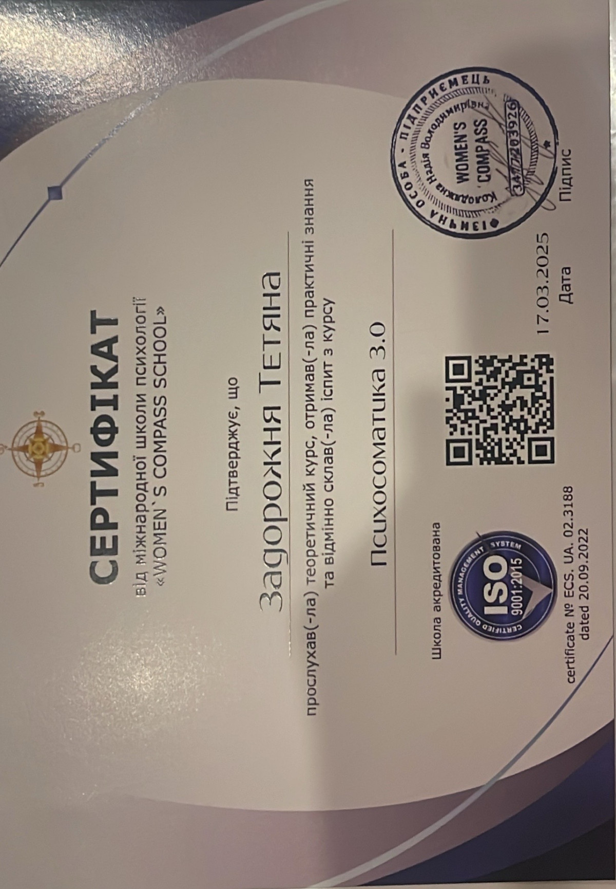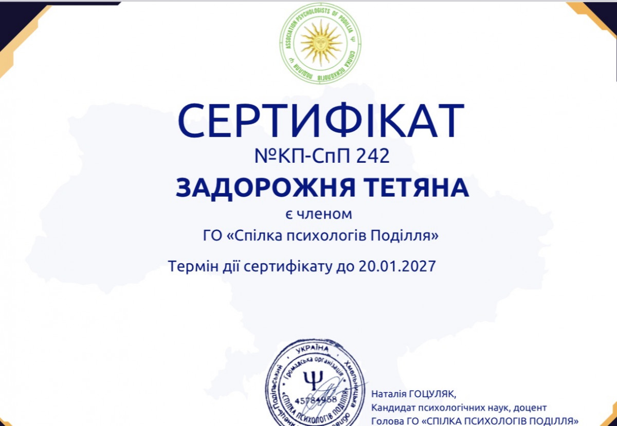 Мене звати Тетяна Задорожня, я - психолог консультант, працюю в психоаналітичному методі в Просторі Безпеки (Safety Space). Досвід роботи - 2 роки.