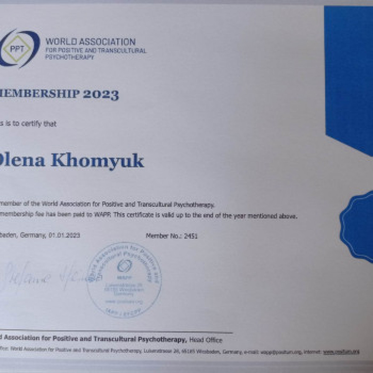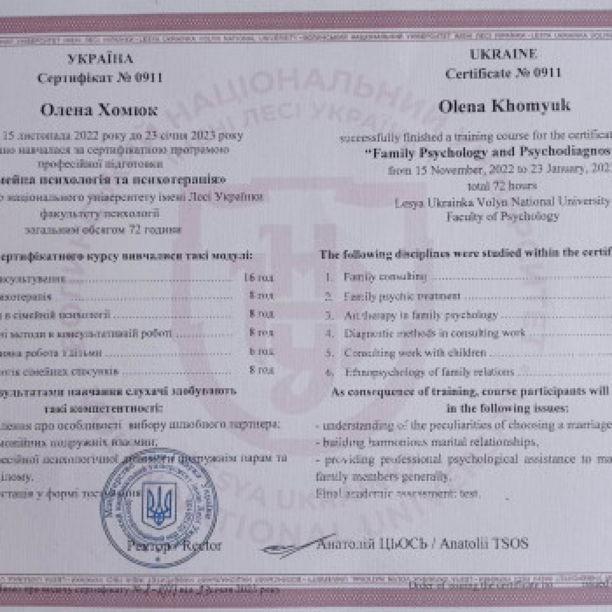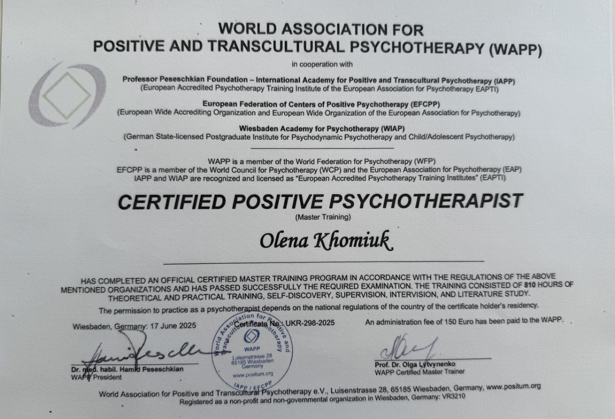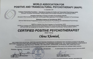 Сертифікований психолог - консультант у методі позитивної психотерапії з 2021р..