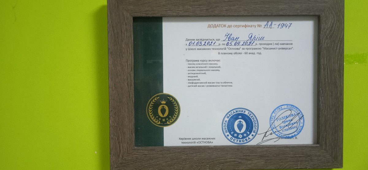 ✓ Навчався в Школі масажних технологій " OSTNOVA" - за спеціальністю масажист універсал