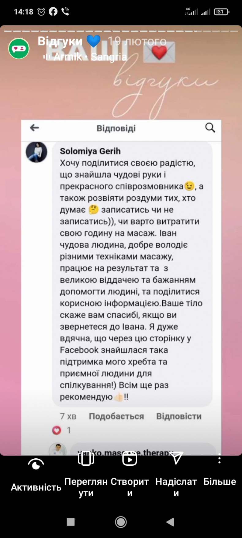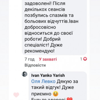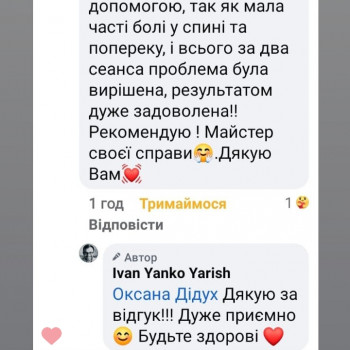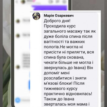 Довгий час користуюсь послугами масажу у Івана завжди задоволенна результатом! Спробувала новий вид масажу Гавайський! Це щось неймовірне!! Хто в пошуку нових вражень релаксу, то рекомендую спробувати саме цей вид масажу!