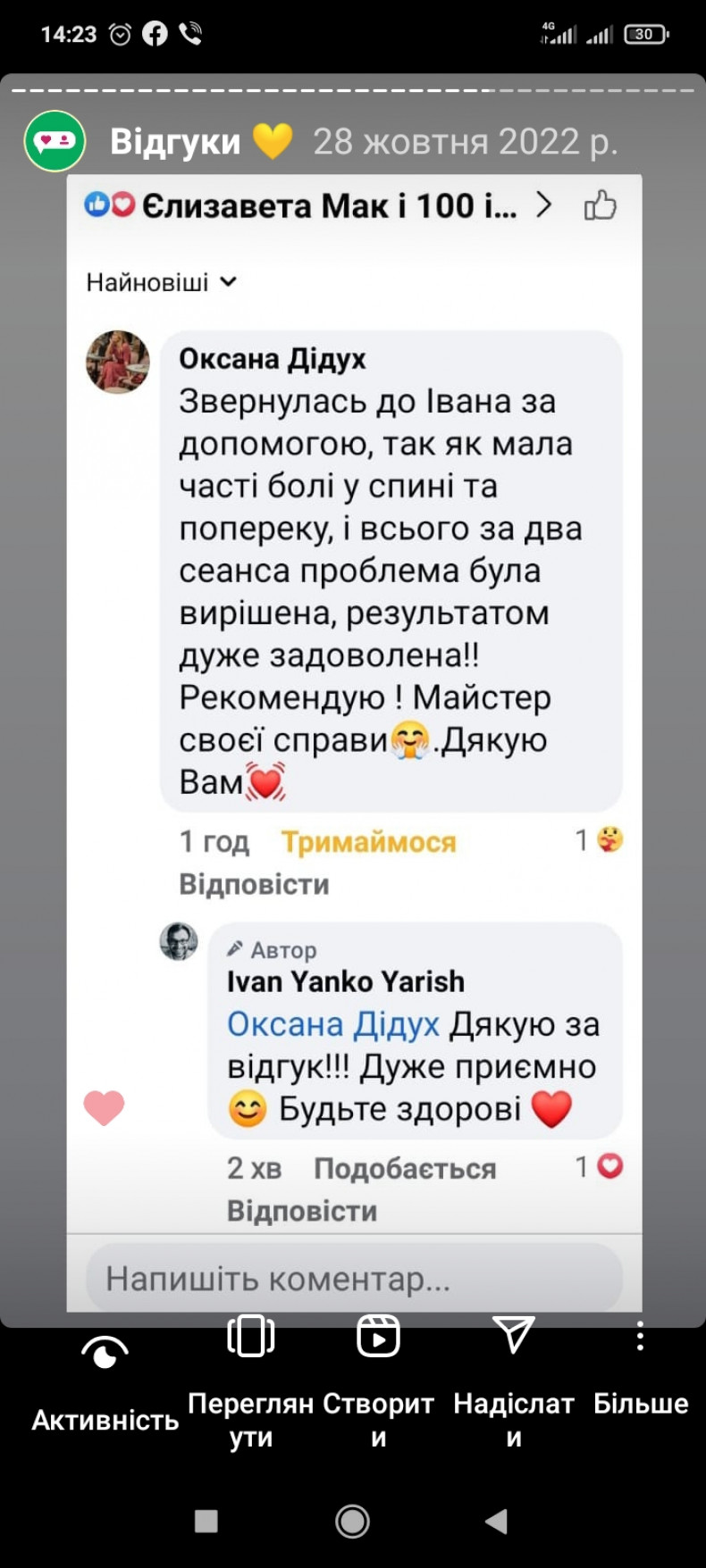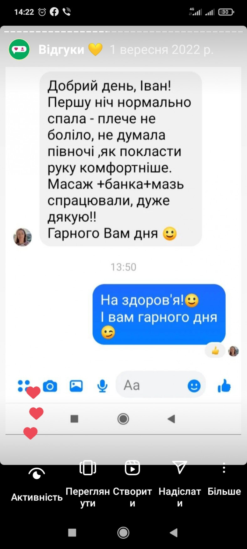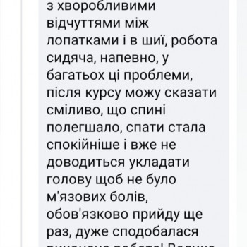 Прийшла до Івана з болями у спині, та після трьох сеансів баночного масажу всі больові симптоми зникли! Дякую, рекомендую.