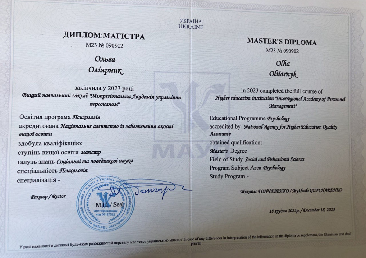Основна спеціальність: Психолог