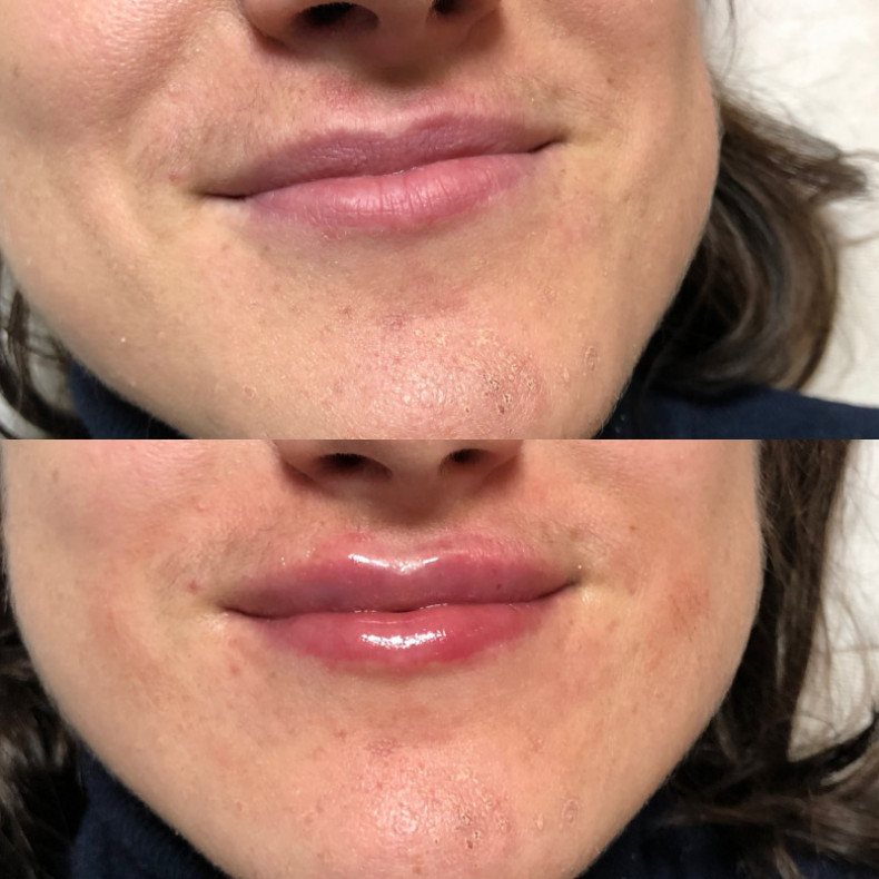 Збільшення об’єму губ з допомогою філлера на основі гіалуроновоі кислоти. Повна біосумісність, з часом зникає без будь-яких наслідків.