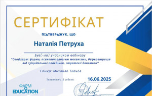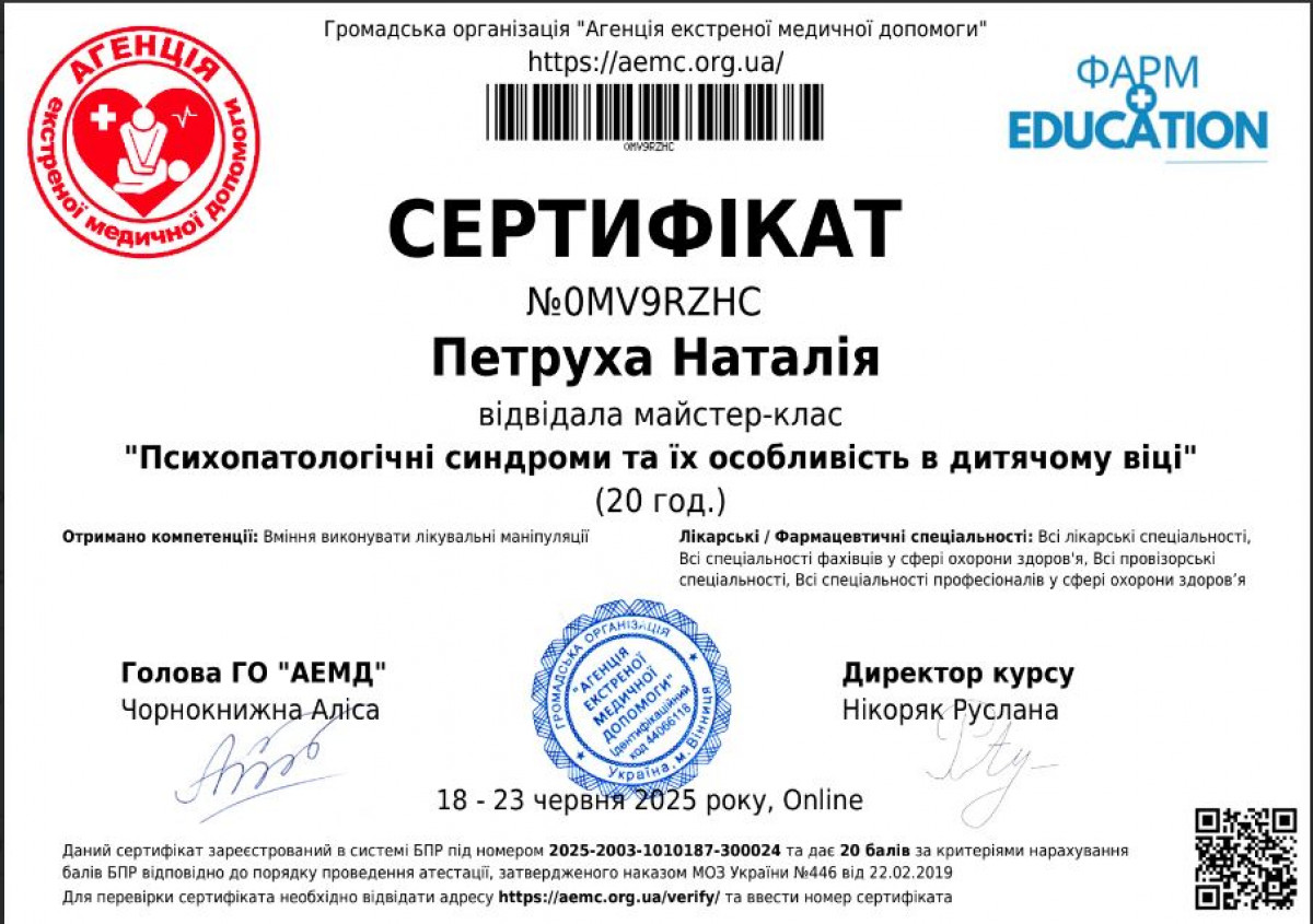 Додаткові спеціалізації: Підлітковий психолог, сімейний психолог, гештальт-терапевт