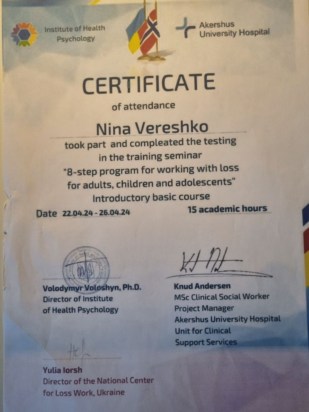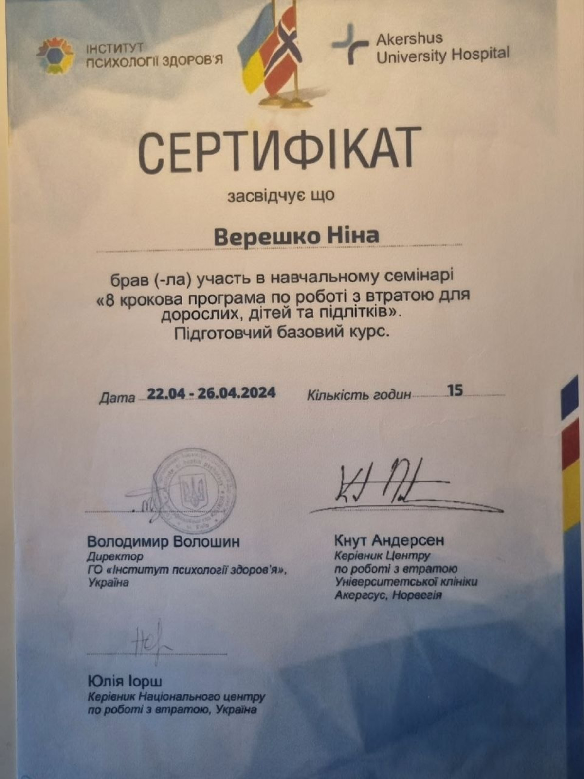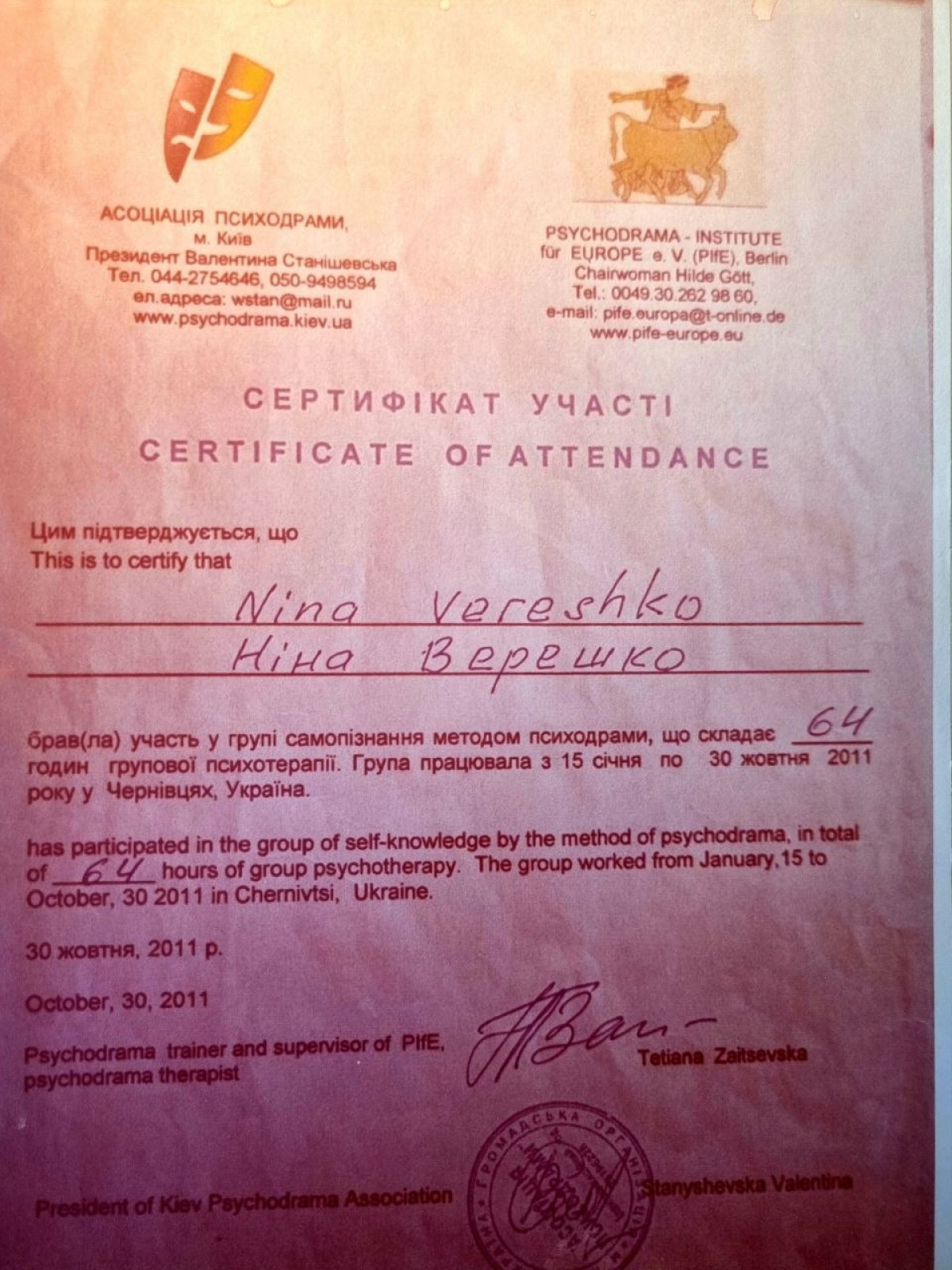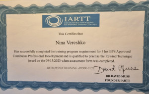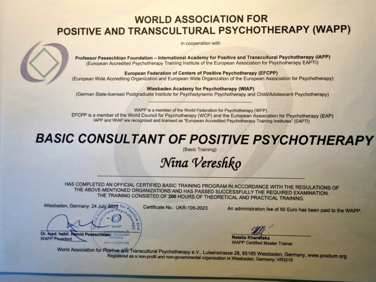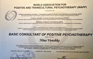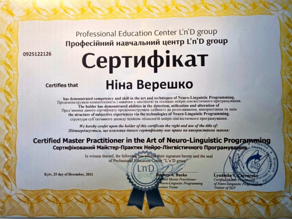 За другою вищою освітою: Практичний Психолог. НЛП Майстер. Психосоматолог. Консультантка у методі Позитивної Психотерапії.Членкиня у Всесвітній Асоціації Позитивної Психотерапії та Комплекс Травма Інститут Британії.