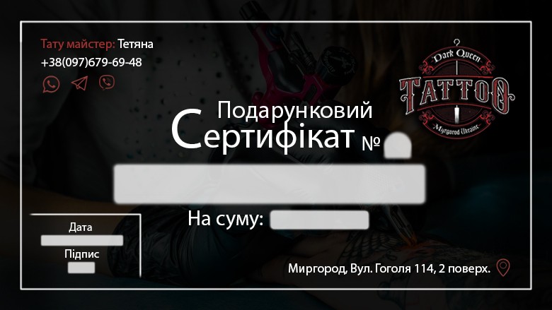 Є варіант продажу подарункових сертифікатів на татуаж, та інший перманентний макіяж,ТАТУ, пірсинг, ультразвукову чистку, массаж. Сертифікати іменні, персональні на будь - яку суму, послугу та зручний для вас час. Всі процедури проходять в дуже теплій і приємній атмосфері, зі стерильними поверхнями і інструментами