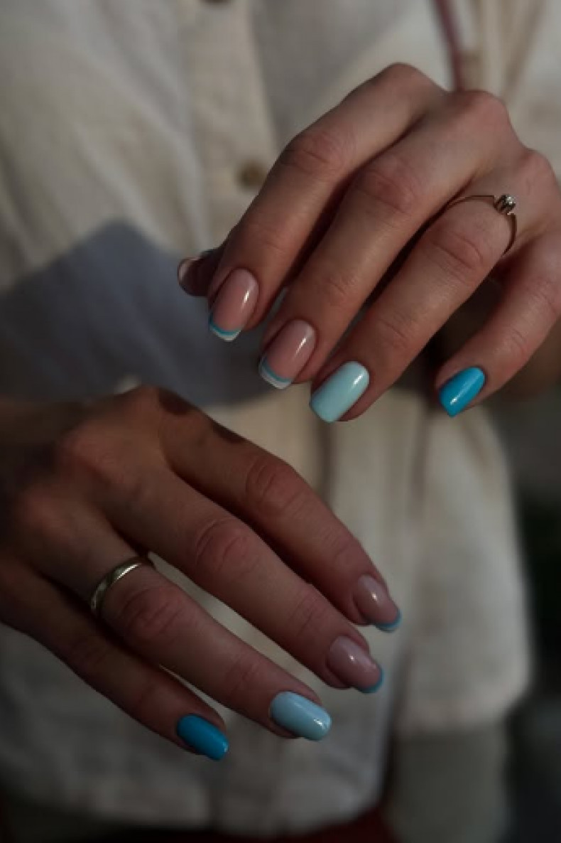 літній французький манікюр, тілесний манікюр, манікюр з кульбабами, стільний манікюр, манікюр з принтами