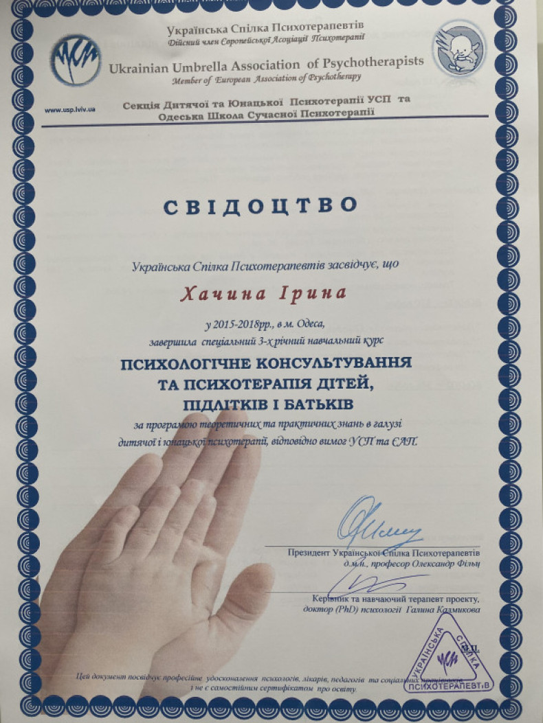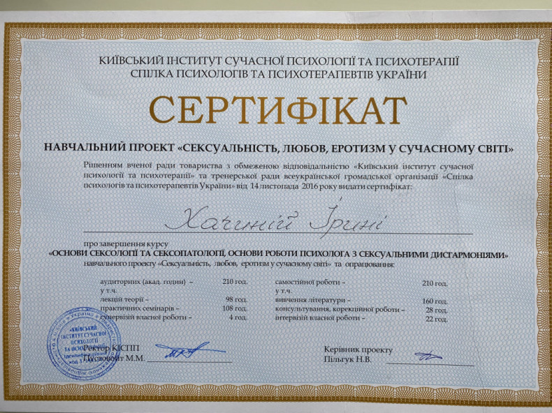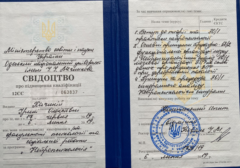 Я практикуючий психолог, психотерапевт. Маю спеціалізації нейропсихолога і сексолога. Практикую з 2014 р., Член Української спілки психотерапевтів.