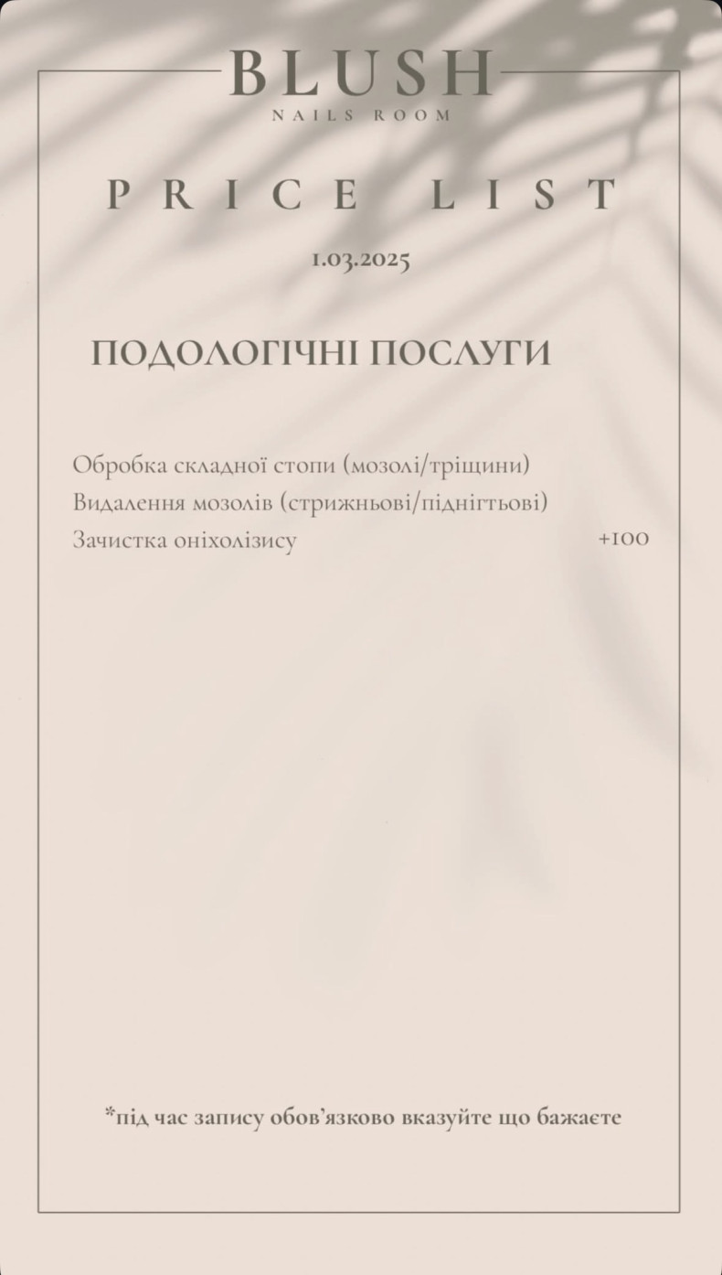 | Догляд за стопами | 700 грн. / 60 хв |