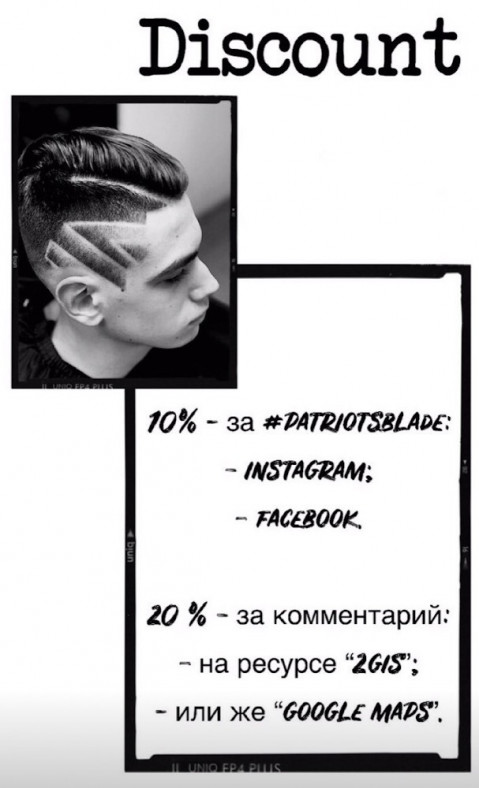 Напиши отзыв на ресурсе "2ГИС" или "Google" и получи скидку на услугу стрижки - 20%