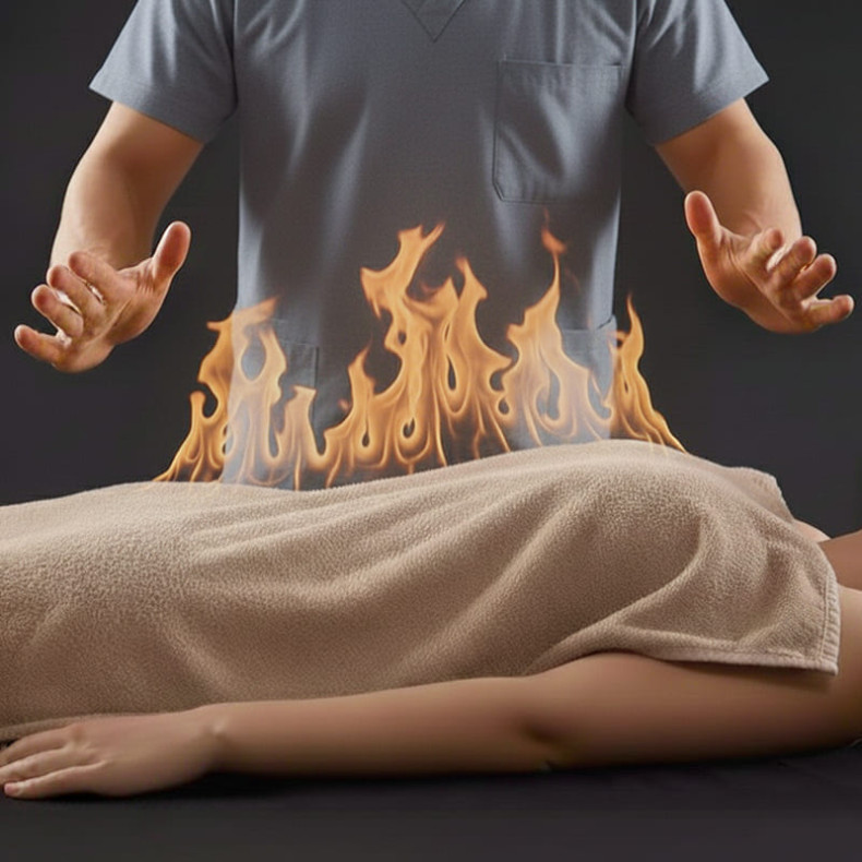 Цей масаж дуже цінний тим, що під час масажу вогнем спалюється весь енергетичний негатив, знімаються енергетичні блоки. Вогонь випалює все!