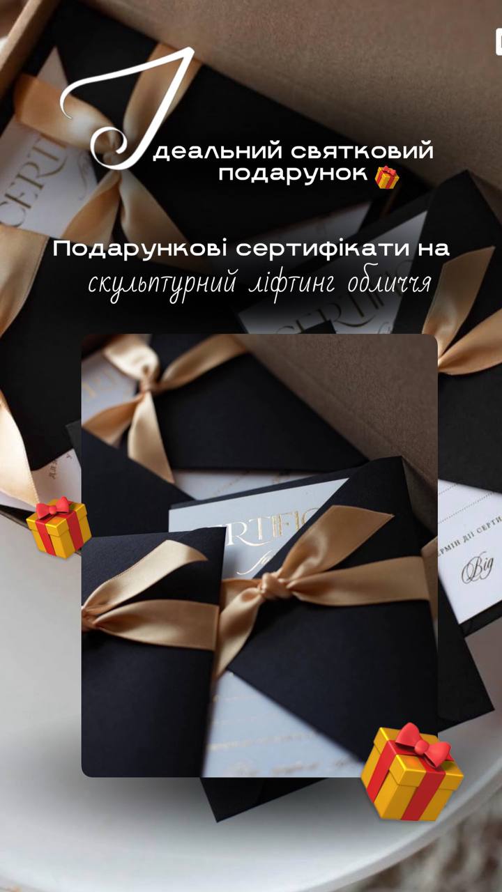 У мене ви можете придбати подарунковий сертифікат — красивий і продуманий подарунок до будь-якого свята. Це не просто процедура. Це час для себе, відновлення і любов до себе. За сертифікатом можна отримати: • Скульптурний ліфтинг та масаж обличчя • Доглядові процедури • Акупунктуру • Підбір домашнього догляду та крему відповідно до типу обличчя • Професійну косметику для підтримки результату вдома Ви даруєте не послугу — ви даруєте стан ? Тепло. Турботу. Впевненість. Сертифікат можна оформити на будь-яку суму або процедуру.