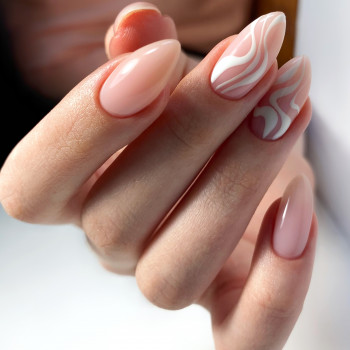 На бежевій основі відмінно виглядають будь-які візерунки та малюнки, які слід підбирати залежно від пори року. На коротких нігтях ефектно виглядають вертикальні смужки, що дозволяє візуально подовжити їх. Особливий шарм мають мереживні орнаменти з чорним, а горошок різного розміру – миле та ніжне рішення, яке легко виконати.