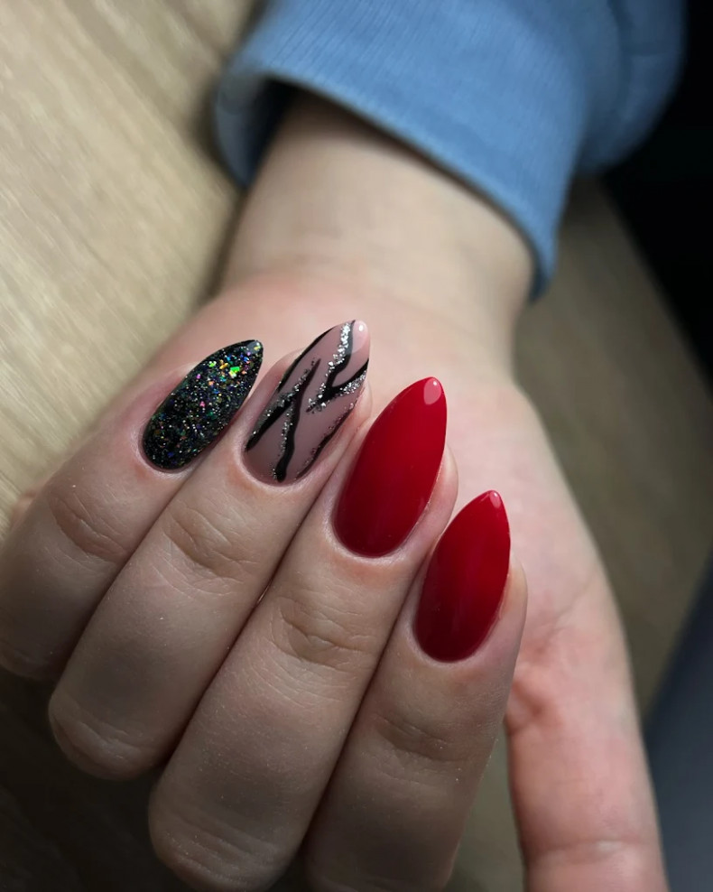 Не втрачають своєї популярності втирка та гліттер, які використовуються при створенні червоного манікюру.