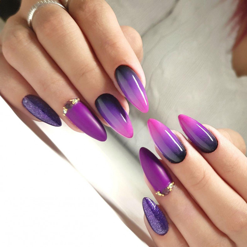 Багатобарвний градієнт: У цьому виді градієнтного манікюру використовуються різні кольори, створюючи плавний перехід від одного до іншого. Наприклад, можна вибрати кілька відтінків синього, фіолетового та рожевого кольорів для створення багатобарвного градієнта.