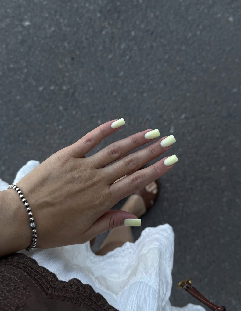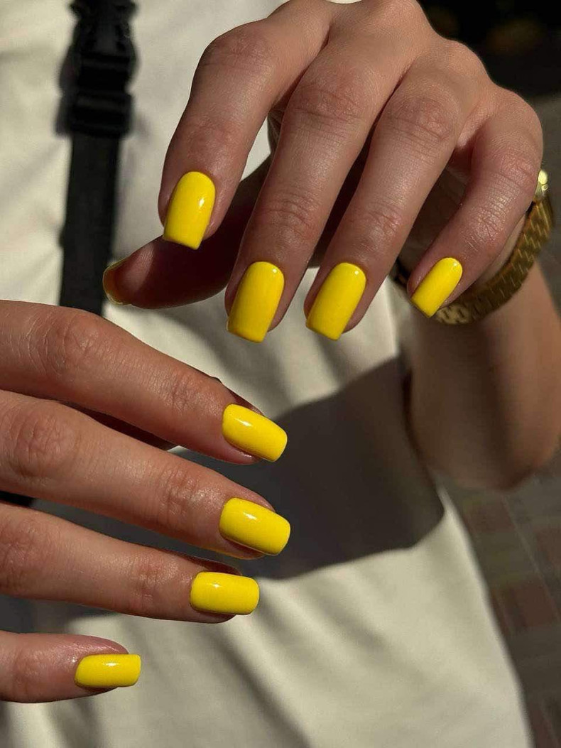Класичний однотонний: Просто нанесіть лак лимонного кольору на всі нігті. Це простий, але стильний варіант, що підійде до літнього образу.