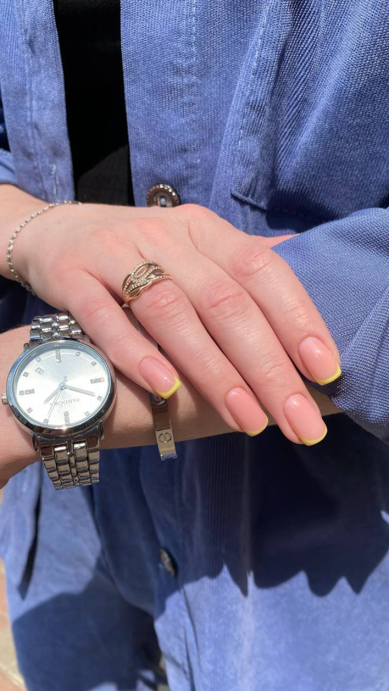Лимонний френч: Почніть із прозорої або нюдової основи, а на кінчики нігтів нанесіть лимонний колір.