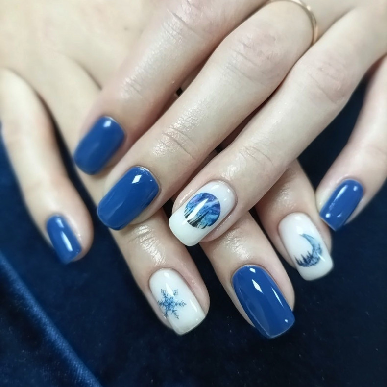Даючи волю уяві, на нігтях можна створювати складні композиції, малюнки та візерунки з використанням синього кольору. Дизайн гармонійно поєднується з іншими трендами: