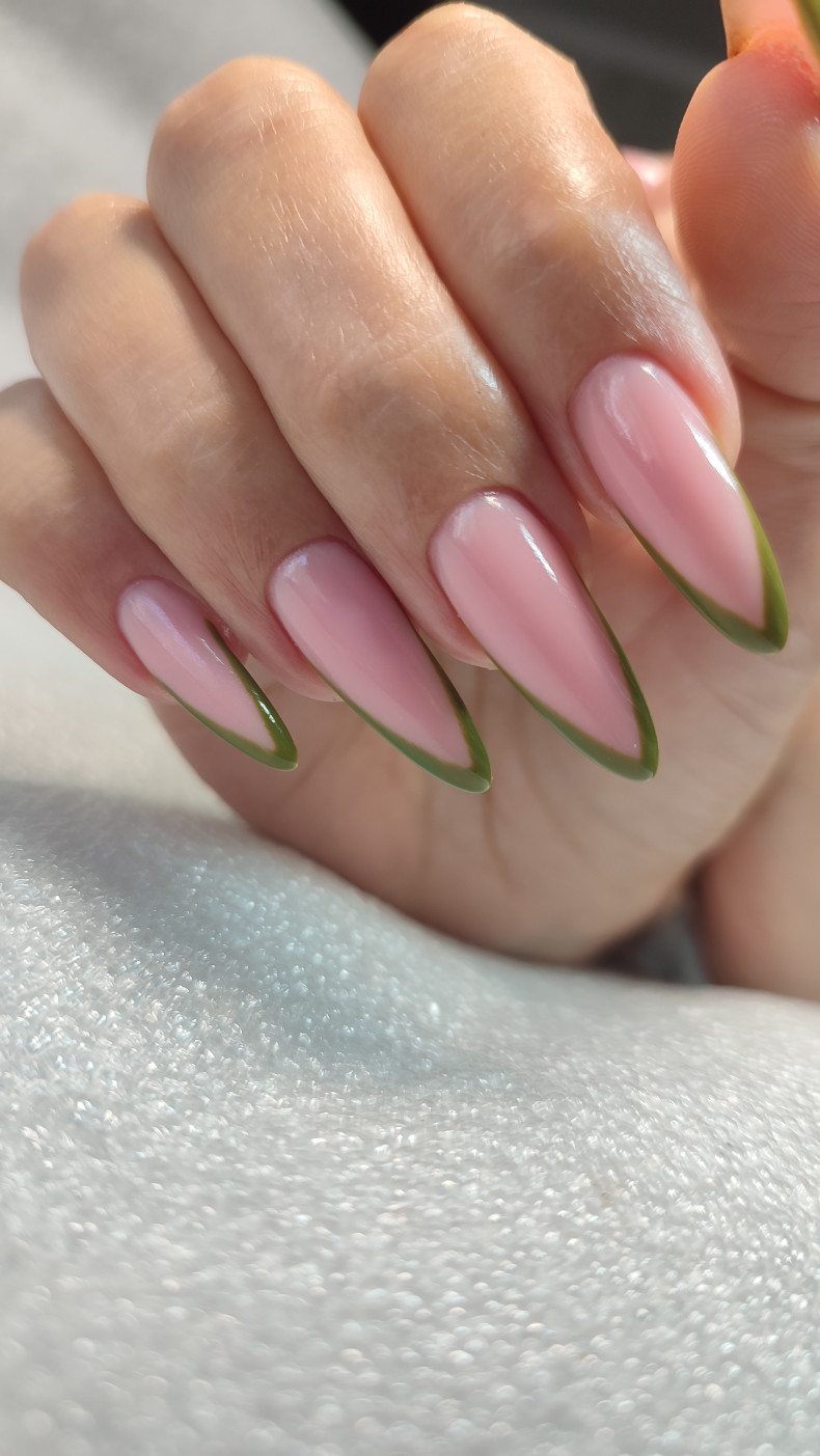 Глянцеві та матові варіанти оливкових нігтів виглядають виграшно з білим або чорним мереживом. Французький манікюр також можна зробити з оливкових відтінків.