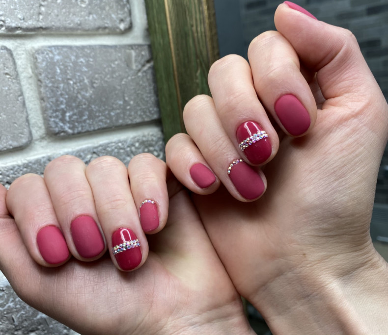Якщо на довгих нігтях інтелігентно виглядає блідо-рожеве покриття, у випадку з короткими і яскраво-рожевий манікюр зі стразами не виглядатиме вульгарно.