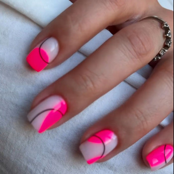 Якщо омбре дозволяє досягти м'яких і плавних переходів з розмитими межами, то у випадку з геометрією справи інакші. За допомогою неонових лаків можна зробити гарні фігури, чіткі лінії та візерунки. Трендовим дизайном вважається манікюр з неоновими «осколками».
