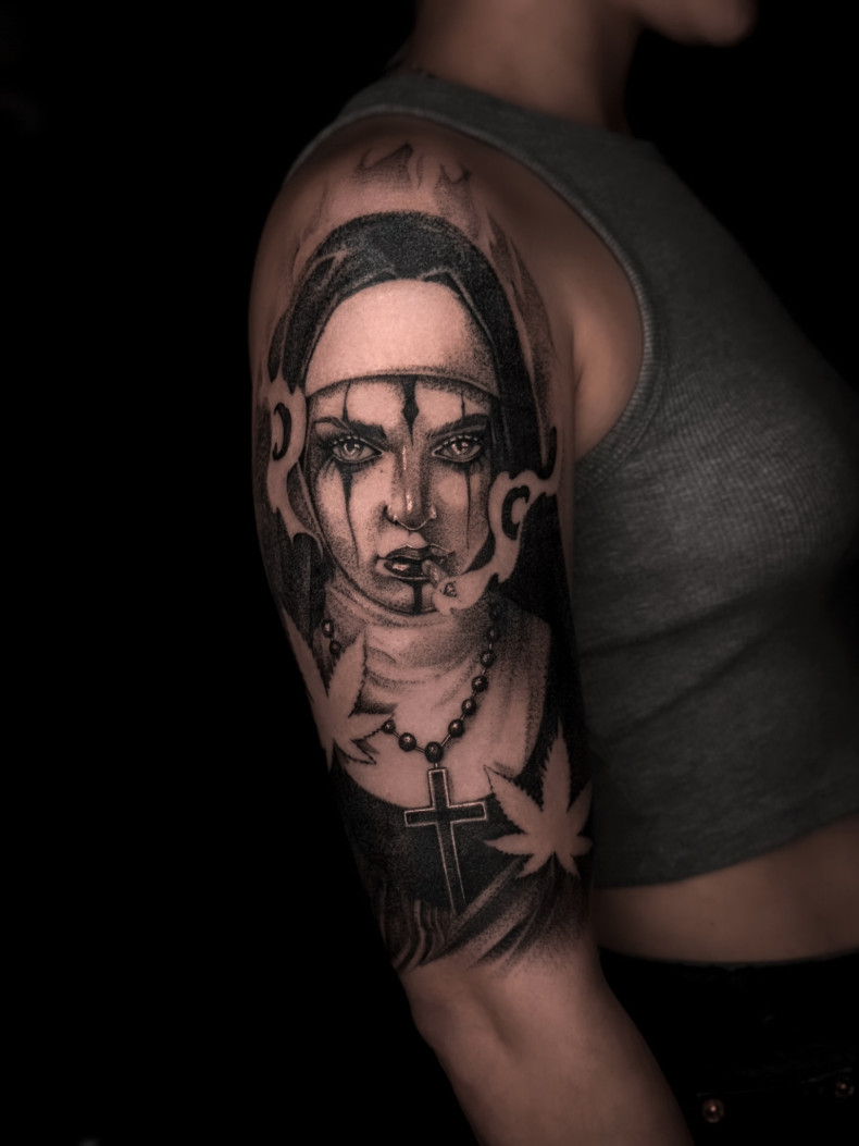 Монашка з сигаретою, келихом вина або оголеними ділянками тіла — неоднозначність або символ боротьби зі спокусою. Іронічне зображення свідчить про заперечення духовності. Їх часто обирають атеїсти та недовірливі люди. А помітні ескізи з кривавими сльозами та ранами зазвичай ототожнюють із пережитими труднощами.