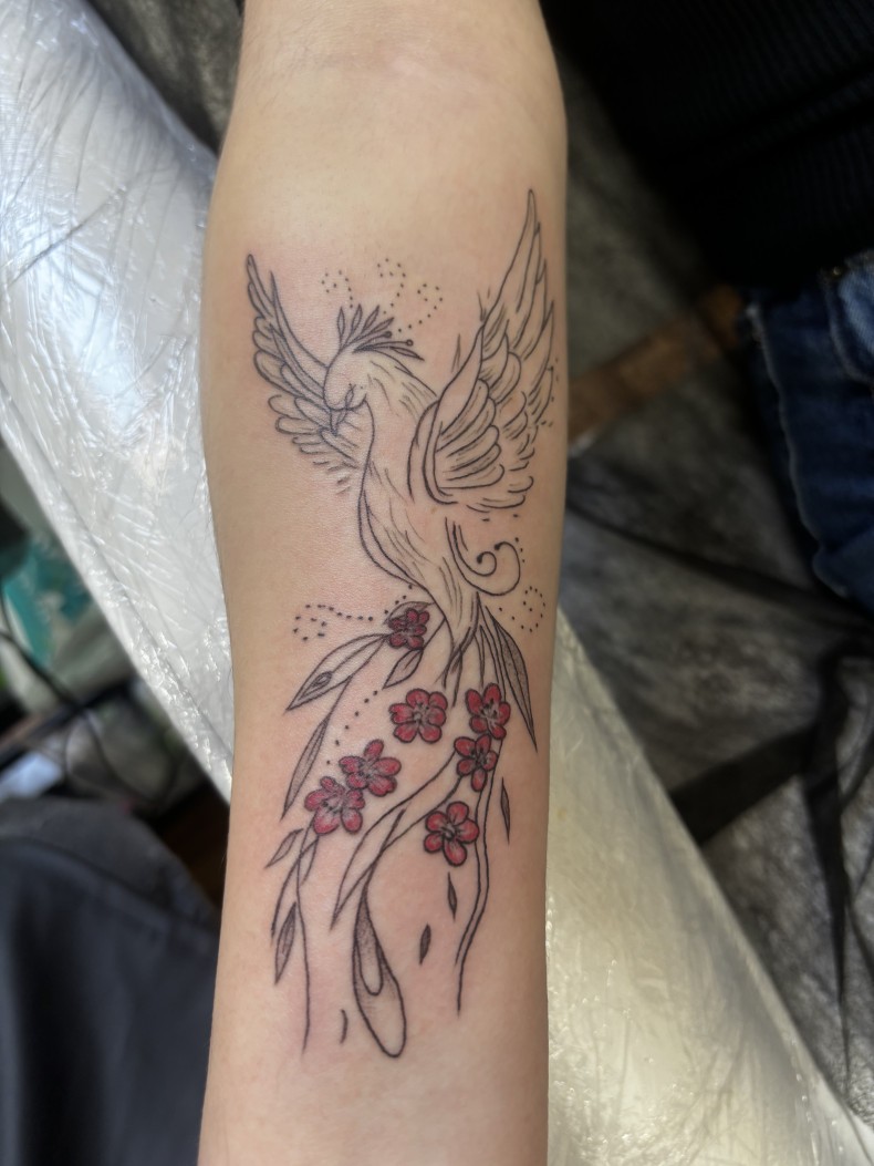 Для кольорового татуювання найкращим вибором буде акварельний стиль. Яскраві вогняні «мазки» найкраще передають динаміку польоту птиці та розмах її крил.