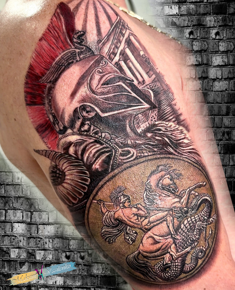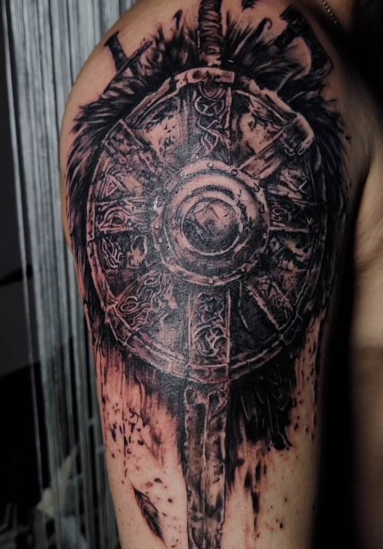 Захист та безпека: Щит традиційно асоціюється із захистом та безпекою. Це може символізувати бажання носія татуювання захищати себе та своїх близьких, а також його готовність протистояти небезпекам.