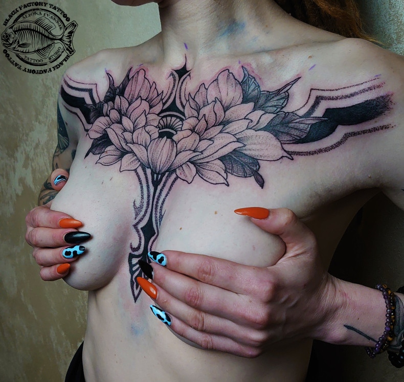 Для чорно-білих ескізів частіше вибирають малюнки в стилі «віпшейдинг», з композиціями з троянд або півоній. Кольорові тату часто набивають в техніці акварелі, яка найкращим чином передає соковитість відтінків і фактуру пелюсток.