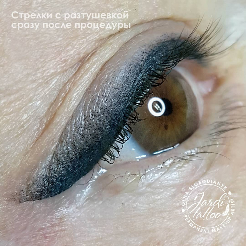 Теневая растушевка на веках (пудровое напыление) включая заполнение межресничного пространства (межресничка), позволяет сделать акцент на глазах, исполняется в разных объемах. Держится в среднем 1-2 года, уходит сужаясь в сторону ресниц.