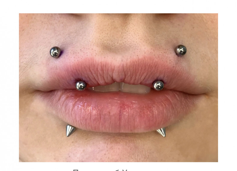 Можливі ускладнення:Інфекції, набряк губ, ризик пошкодження зубної емалі або ясен через тертя внутрішньої частини прикраси.