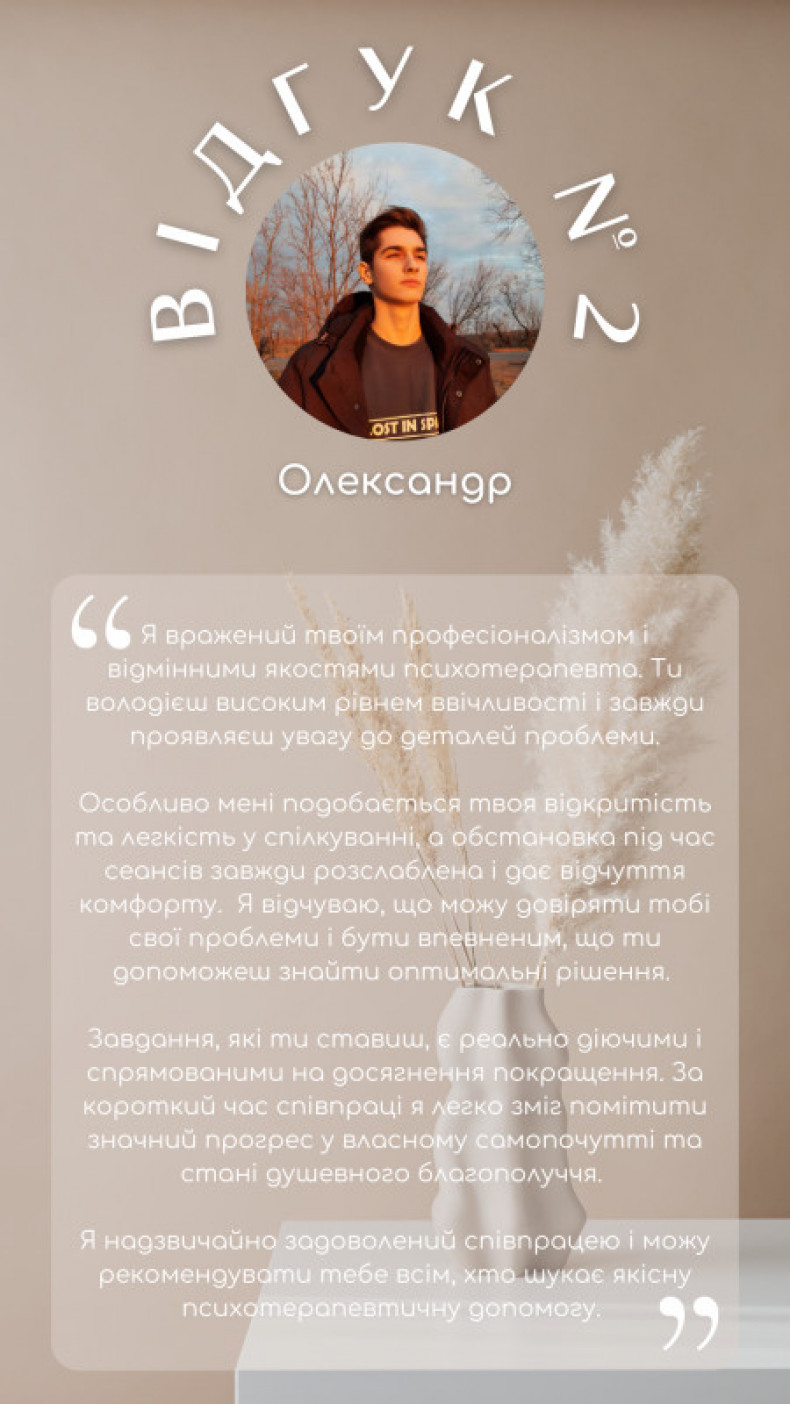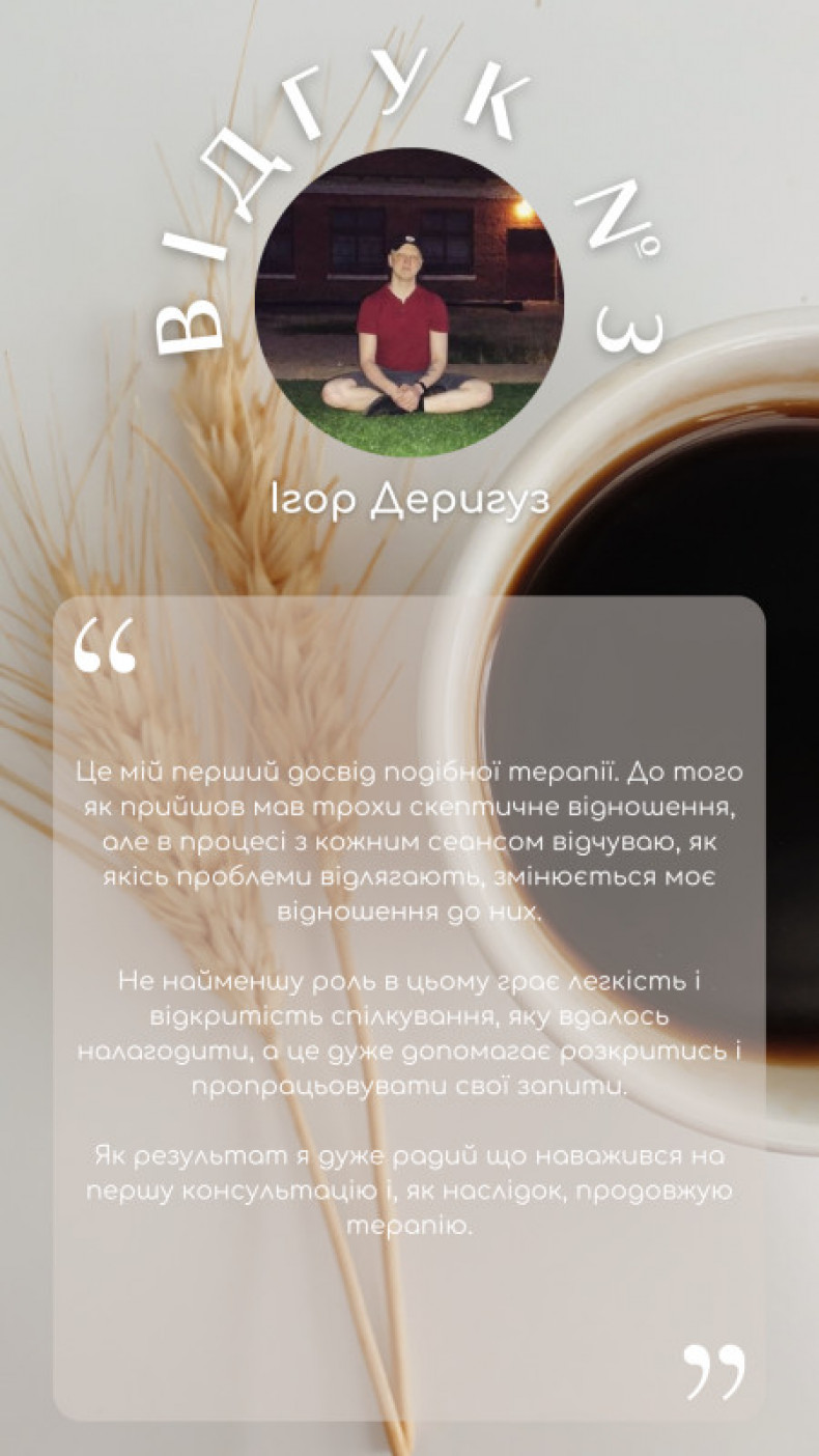 Дякую за допомогу. За сеанс трапилося кілька одкровень, а головне з'явилися сили та бажання працювати над собою. Професіоналізм, уміння швидко зрозуміти проблему. Готовність підлаштуватися та виділити більше часу, ніж планувалося.