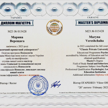 Привіт! Якщо ти тут то я точно зможу бути для тебе корисною. Я пройшла навчання на психолога, закінчила першу сходинку Київського Університету Гештальту та продовжую навчання на гештальт терапевта. Весь час вдосконалюю та поповнюю свої знання та навички (про це свідчать сертифікати з додаткового навантаження). Здобуті мною знання та навички дозволяють мені вести якісне консультування та покращувати якість твого життя! Я маю досвід роботи...
