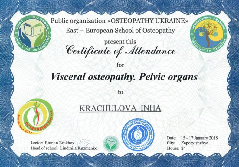 Квалификация, согласно программы подготовки Восточно-Европейской школы остеопатии, уровень — практик.