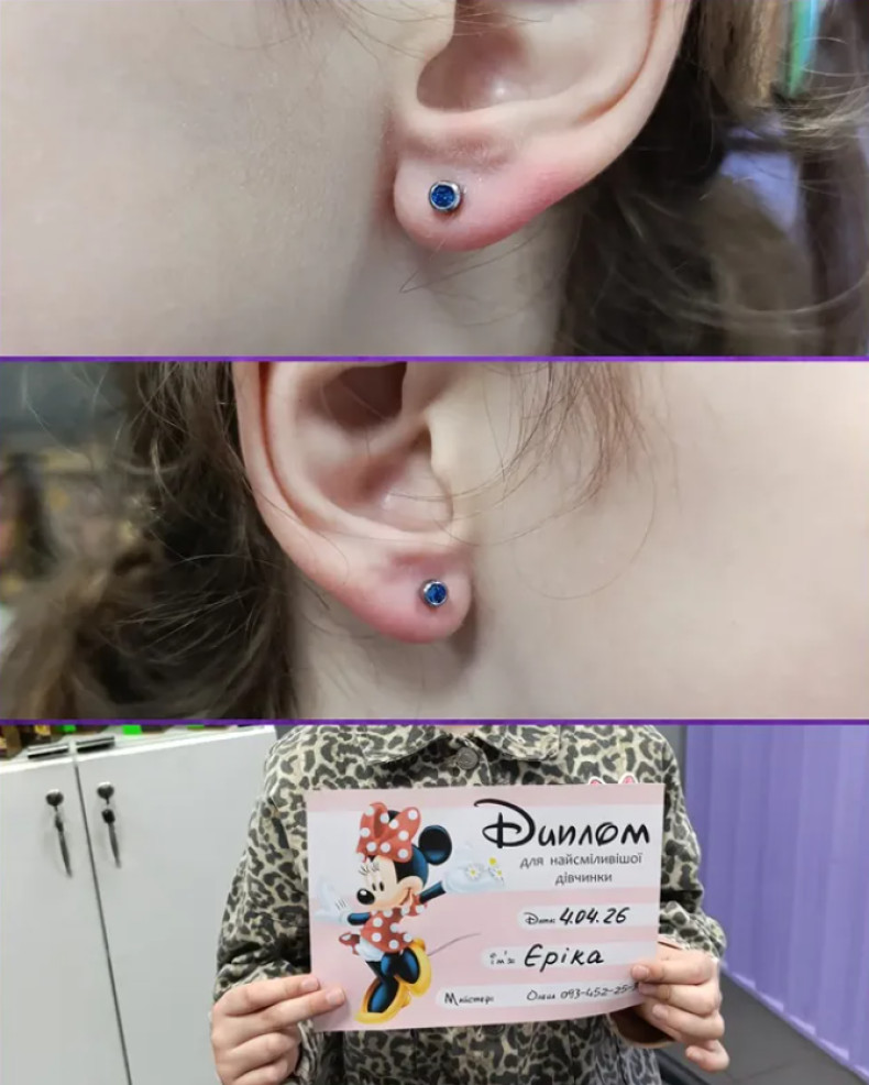 Проколювання вух пістолетом дітям зі стерильними пусетами (оригінал, офіційна співпраця) Studex.Пістолет проходить дезінфекцію розчинами та стерилізацію в УФ-шафі, що робить процедуру повністю безпечною, стерильною та швидкою. Після процедури ви отримуєте пам'ятку та диплом для дитини.