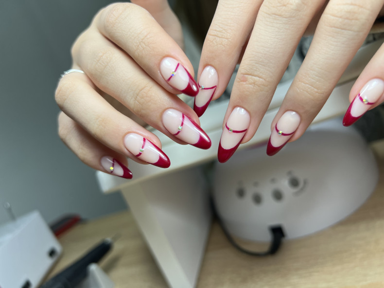 малиновий манікюр, корекція нігтів, манікюр з розлученнями, манікюр із фольгою, яскравий літній манікюр