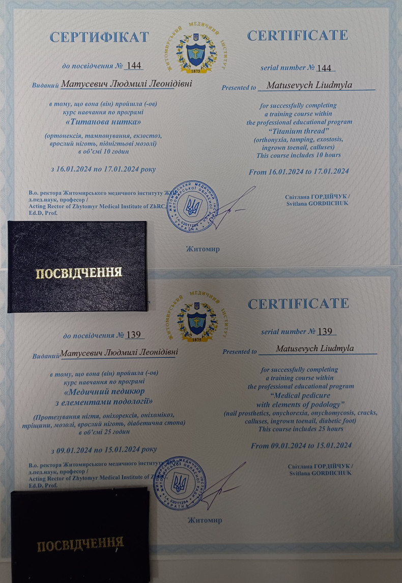 Це основний перелік, але існує ще безліч проблем нігтів і стоп, які допоможе вирішити подолог. Якщо вас турбують ваші нігті на ногах, шкіра стоп, або ви бажаєте уникнути проблем у майбутньому, звертайтесь до мене, я допоможу вам 😉.