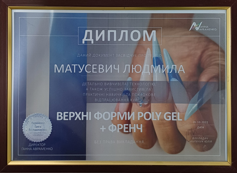 Мене звати Людмила. Я мама 2-х дітей. Працюю nail-майстром з 2013-2014 року по сьогоднішній день. Але мені хотілось більшого і я вирішала пройти навчання на Подолога.