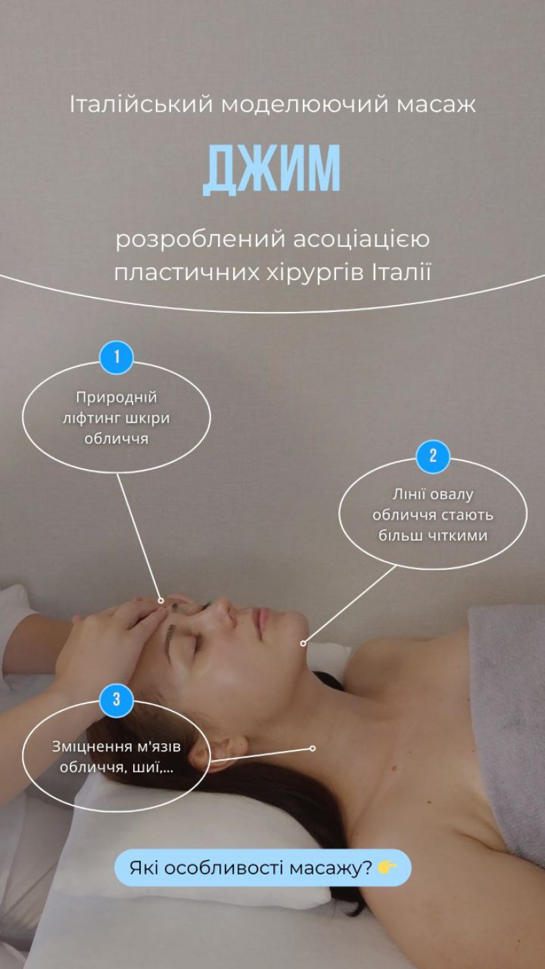 Італійський моделюючий масаж Джим – техніка масажу обличчя, спрямована на зміцнення і підвищення тонусу лицьових м’язів, уповільнення процесу м’язової атрофії, розгладження зморшок і корекцію овалу обличчя. Метод створений асоціацією пластичних хірургів Італії