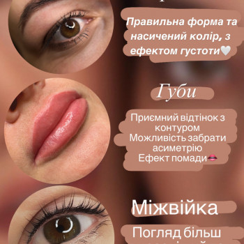 Перманентный татуаж (макияж), брови, глаза (веки), губы.