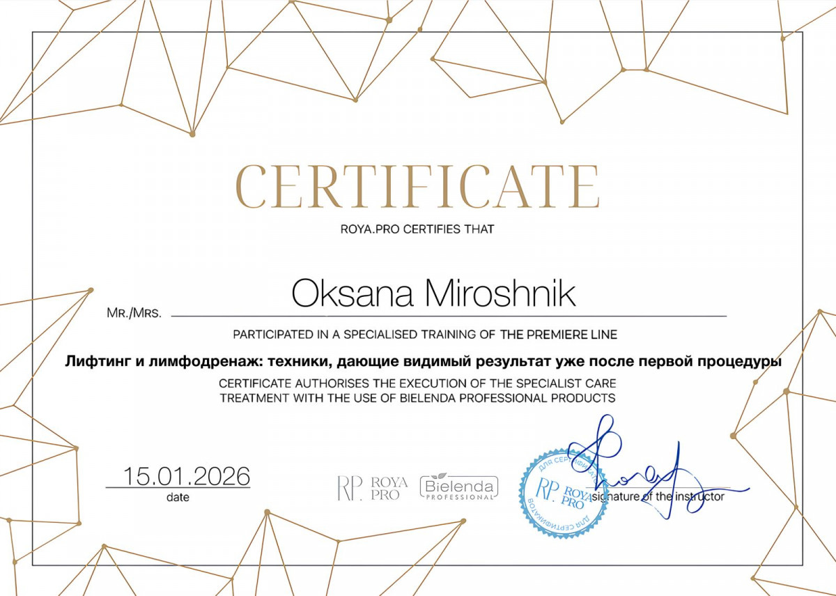 Благодарю за прекрасный массаж лица, профессиональный подход, умение точно оценить состояние кожи лица и дать нужный уход для устранения проблем кожи. Уже после первого визита увидела значительное улучшение моей кожи лица.