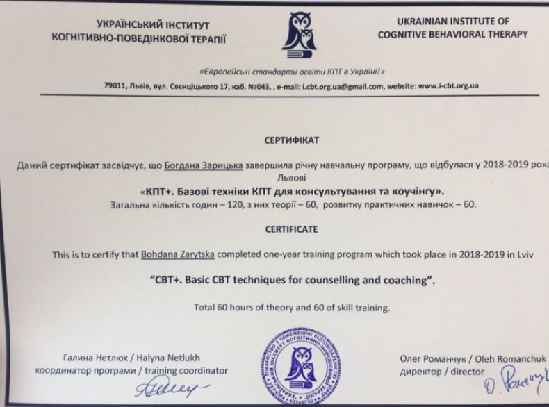 Клінічний психолог, Когнітивно поведінковий консультант, магістр психології.