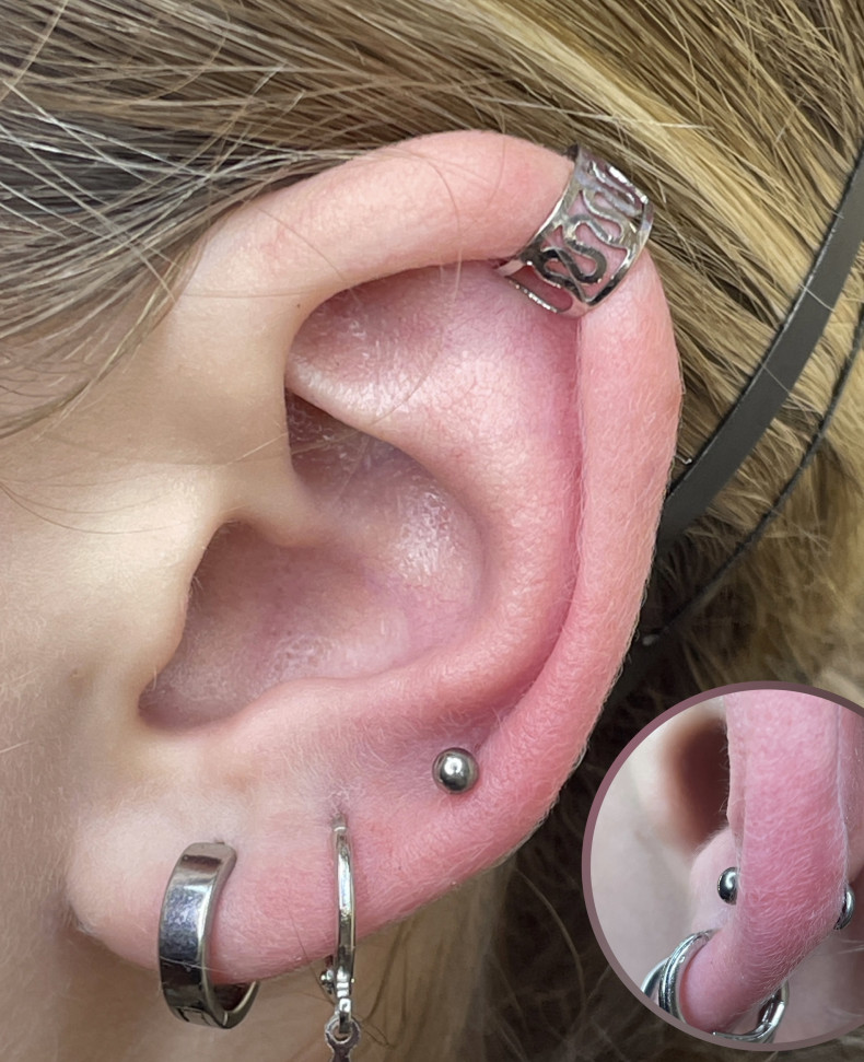 Пірсинг вух ( мочка, хелікс, конч, трагус) , носу, брів, губ (Монро, Мадонна, Медуза, Укуси…), язика, пупка.
